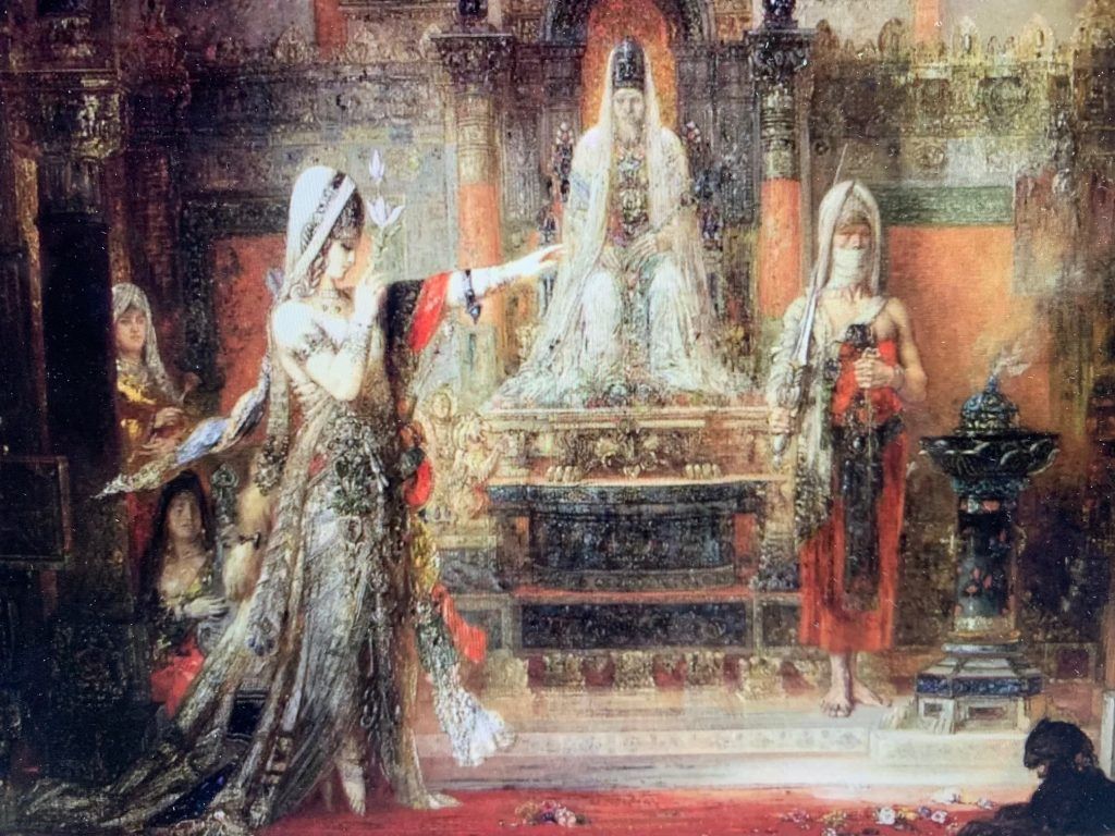 Rappel de la scène : Tandis que la voix du prophète ne cesse de tonner et de condamner depuis le souterrain, Hérode et Hérodias rejoignent Salomé, perdue dans ses pensées. Hérode est à la fois conscient et inconscient du caractère sacré de l’homme qu’il retient prisonnier ; mais pour l’heure, seul compte pour lui l’éclat envoûtant de Salomé. Le Tétrarque la supplie de danser pour lui – ce que la princesse finit par accepter après s’être fait promettre qu’il accèdera, en échange de sa danse, au moindre de ses désirs. Salomé entame la Danse des Sept voiles, au cours de laquelle elle se dévêt peu à peu pour terminer totalement nue, sous les regards lubriques d’Hérode. Tous les degrés de ses fantasmes se coulent dans l’orchestre moite et luxuriant de Strauss. Son désir sera d’obtenir la tête de Jean le Baptiste afin de lui baiser sa bouche.