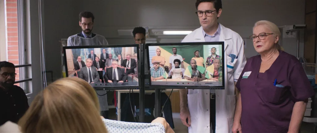 Dominique, sage-femme historique de cet hôpital, prend sa retraite ce soir. Mais de bon matin elle fait connaissance avec Antoine (Nicolas Maury dans un rôle très en retrait faut-il préciser), le nouvel obstétricien, frais émoulu de ses études, un brin sûr de lui et de l’autorité naturelle que lui donne son diplôme… C’est justement le jour que vont « choisir » cinq parturientes pour donner le jour à leur bébé. Ces cinq femmes ont des parcours de vie bien particuliers qui vont donner l’occasion au réalisateur de filmer une véritable comédie humaine dont le fil rouge ne sera autre, après bien des difficultés, que l’improbable duo Dominique et Antoine. Passons rapidement sur une séquence aussi liminaire que dispensable qui nous montre comment ces dames sont tombées enceintes… C’est la suite qui est intéressante.  Il y a d’abord Chloé (Florence Loiret-Caille) qui ne veut absolument pas accoucher sans son mari Guillaume (David Marsais) à ses côtés. Sauf que celui-ci est à l’autre bout de la France… Nous rencontrons ensuite Sophie (Alice Pol) qui est enceinte à la suite d’une rencontre internet avec une dénommé Jérôme (Tom Leeb), perdu de vue depuis plus ou moins 8 mois et arbitre de football. La séquence est à hurler de rire ! Il y a Estelle (Sarah Stern) qui, elle aussi, veut accoucher en présence de son mari Jean-Baptiste (Antoine Gouy), lequel apprend à ce moment –là le décès de son père mais souhaite lui cacher alors que sa belle-mère transforme la chambre d’hôpital en succursale de Katmandou.  Manon (Léa Drucker) est PDG d’une entreprise de lancement de satellites, clé de voûte de toute l’industrie aérospatiale française. C’est pile le moment de faire signer un méga contrat avec les Qataris. Son mari Nathan (Youssef Hajdi) va tenter de mettre de l’huile dans les rouages. Et pour finir, il y a ce « trouple » composé de Lan (Mélodie Richard), sa compagne Clémentine (Fadily Camara) et le géniteur Gaëtan (Thomas Scimeca) qui se verrait bien en papa-poule.