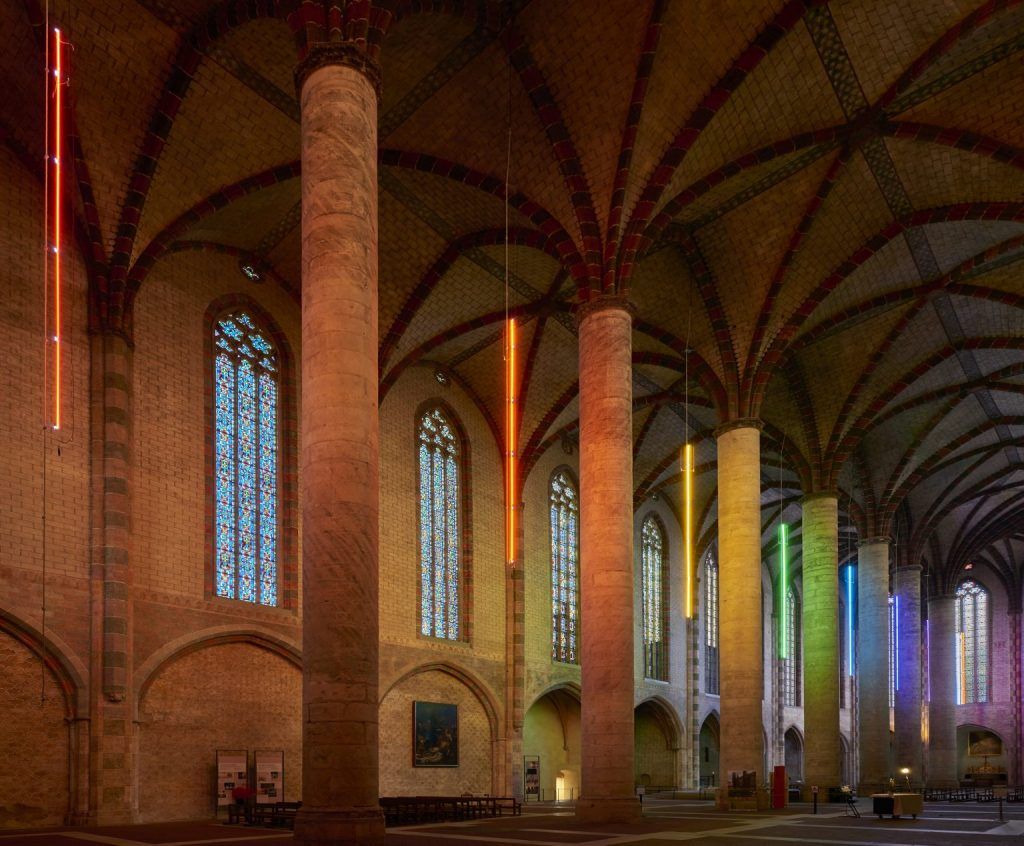 Les visiteurs peuvent ainsi découvrir ou revoir « Mesure de la lumière à Stanley Brown » (photo), néons multicolores de Sarkis suspendus dans la nef de l’église des Jacobins, à la hauteur des fameux vitraux aux reflets changeants qui font chatoyer l’édifice à toute heure. Œuvre de Maurizio Nannucci imaginée pour le festival en 2009, « Going from Nowhere. Coming from Nowhere » est de nouveau visible la nuit, sur la façade de l’Espace EDF Bazacle où est inscrite cette phrase en néon bleu qui évoque le flux de la Garonne. Quant à Laurent Fachard, il réactive sa mise en lumière des berges de la Garonne, vingt ans après sa première invitation à Toulouse.
