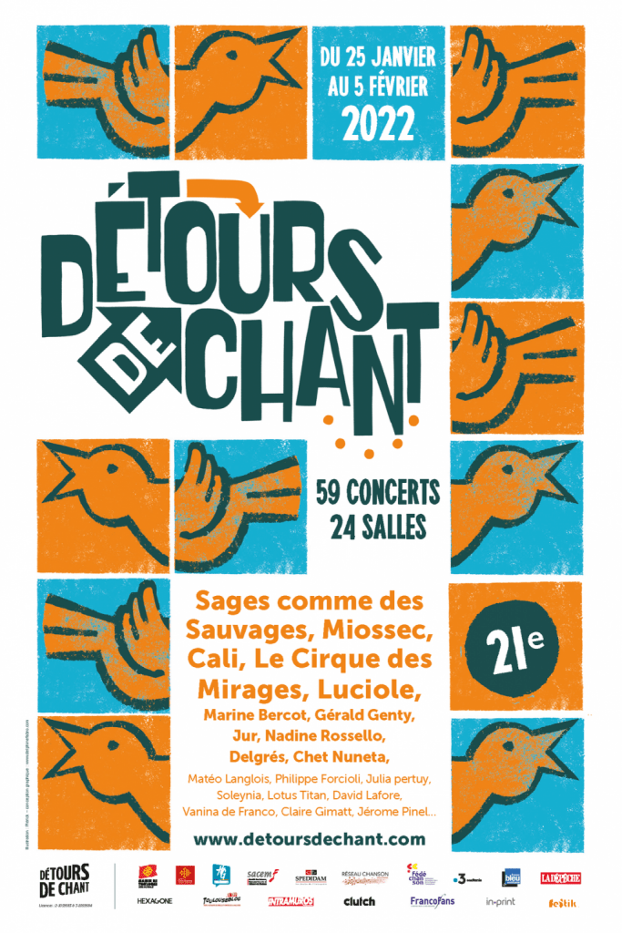 « Retrouvailles joyeuses et artistes en pleine forme : ce sera la fête… 24 salles et 41 groupes d’artistes présenteront de la chanson portée par une multitude de rythmes, de couleurs, d’émotions », expliquent les organisateurs du festival Détours de Chant qui se tiendra du 25 janvier au 5 février 2022.