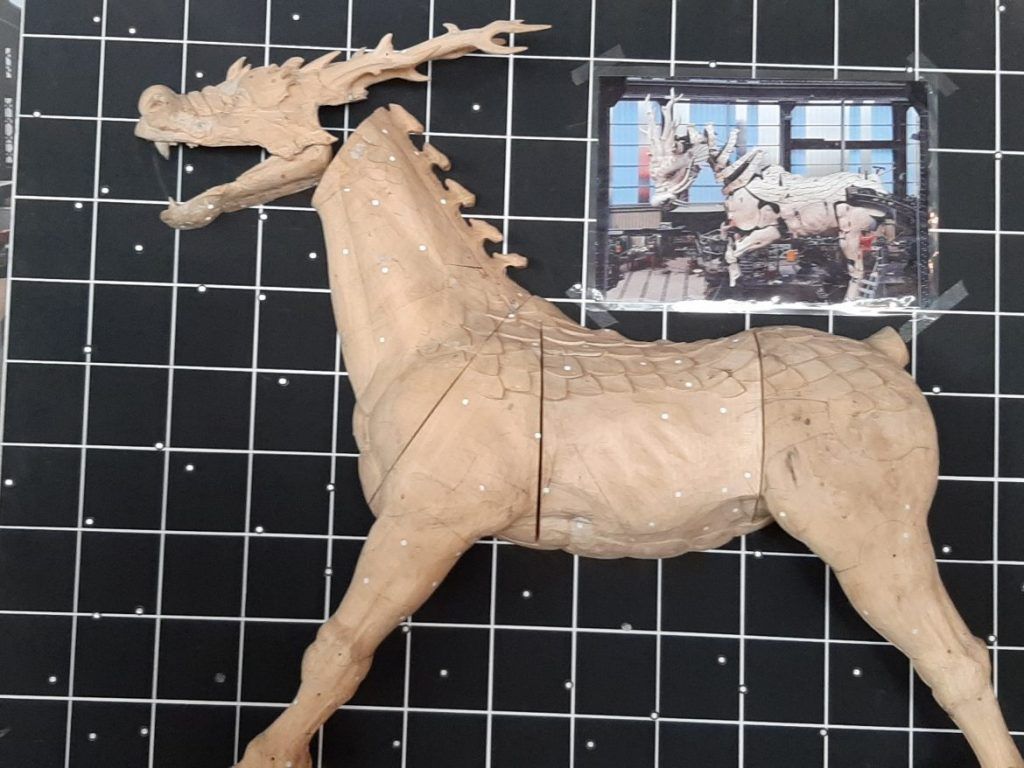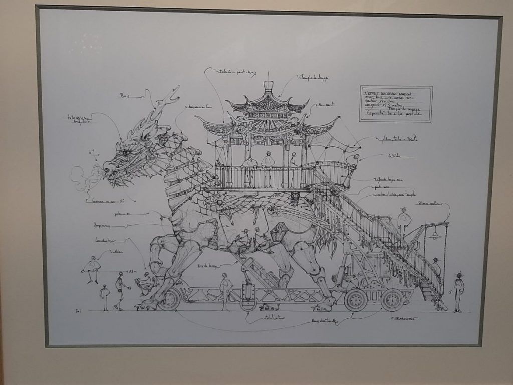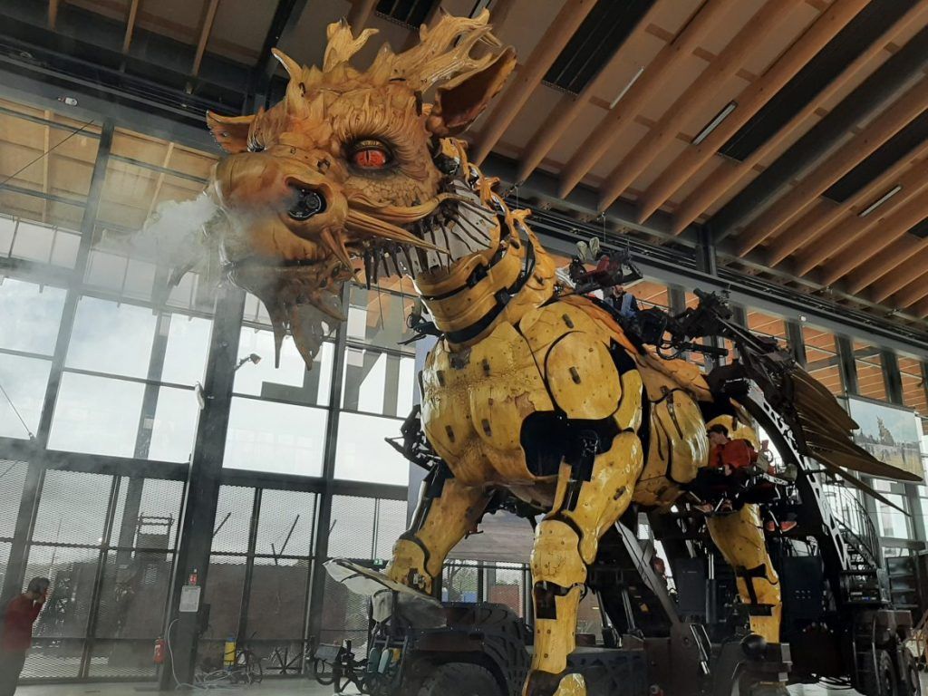 Cette machine emprunte les traits de neuf animaux tels que le chameau, le tigre, le cervidé, le serpent, l’aigle, le bovin, la carpe, le cheval et la tortue. Pour construire Long Ma, ce ne sont pas moins de 45 personnes et plus de 30 corps de métiers différents pour faire naître une créature qui fait une hauteur de 11 mètres, 17,7 mètres de long et 5,5 mètres de large. Composée d’acier, de bois, de cuir, de verre soufflé, de feuilles d’or, de crin de cheval, de toile et de vérins (actionneurs hydrauliques). Long Ma a une particularité elle porte sur son dos un temple inspiré de la Cité interdite. Pour la première fois, elle transportera du public (35 voyageurs) à partir du 19 avril. « Sa construction fut ardue, car l’architecture chinoise millénaire a produit des formes aux courbes et à la géométrie complexes. Les tuiles traditionnelles trop lourdes, ont ici été remplacées parc du zinc roulé-plié sous formes de tuiles puis colorisé et verni », explique la Halle de la Machine. Elle précise : « Des moucharabiehs découpés au jet d’eau ornent toit et côtés. Des motifs imprimés au laser sont agrémentés de finitions en couleurs, peintes à la main. Les colonnes de soutient sont creuses pour rendre la structure la plus légère possible. Sur les arrêtes sont opposées des figurines sculptées inspirées des signes du zodiaque ».