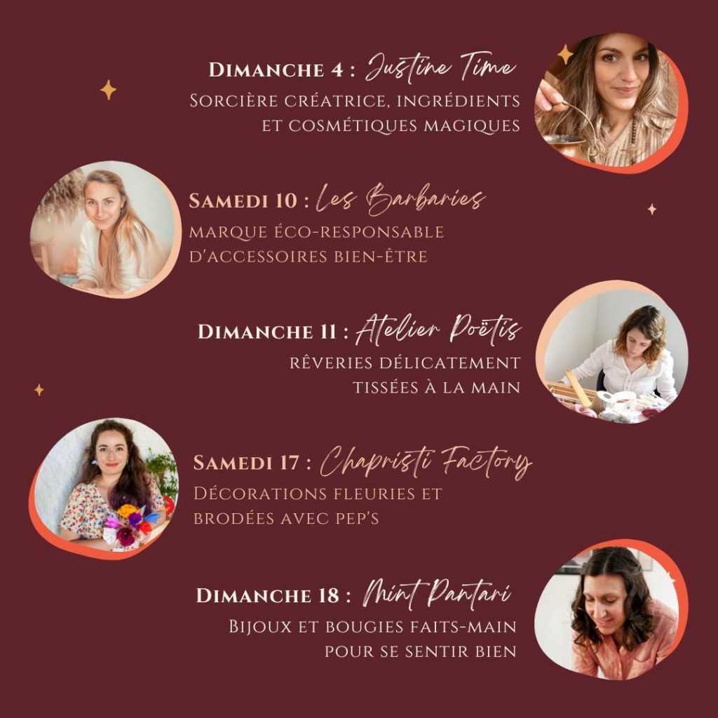 Justine Time a ouvert le bal dimanche 4 décembre avec ses créations empreintes de magie verte. Pour la suite des festivités, la marque écoresponsable d’accessoires bien-être Les Barbaries prendra la relève samedi 10 décembre. Ce sera ensuite au tour d’Atelier Poëtis de présenter ses rêveries tissées à la main, dimanche 11 décembre, des attrape-rêves aux bracelets. Les décorations fleuries et broderies colorées de Chapristi Factory seront les stars de Mintaka & Co samedi 17 décembre, avant-dernier jour de « Trésors de créatrices ». Un dernier jour honoré par Mint Pantari et ses bijoux et bougies faits main. « Pour ajouter un peu plus de magie à ces journées, il y aura aussi des jeux-concours, des démonstrations de techniques, des mini-cookies et infusions offertes », ajoute Mintaka & Co.