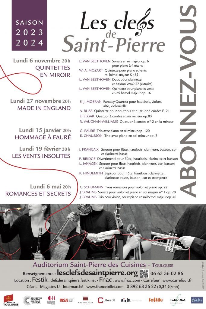 La série des Clefs de Saint-Pierre est née en 2000 du désir des musiciens de l’Orchestre national du Capitole de s’investir dans la pratique de la musique de chambre. Son exploration d’un répertoire ouvert, exigeant et toujours inventif se poursuit et se renouvelle pour 2023-2024. Les concerts de cette prochaine saison élargissent encore l’esprit original de cette démarche. Aux cinq programmes habituels des lundis à 20 h, toujours à l’auditorium Saint-Pierre des Cuisines, s’ajoute cette fois un concert hors abonnement, en partenariat avec l’Opéra national du Capitole.