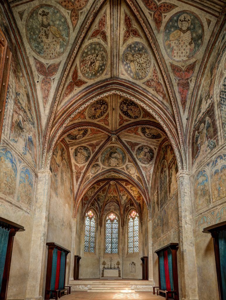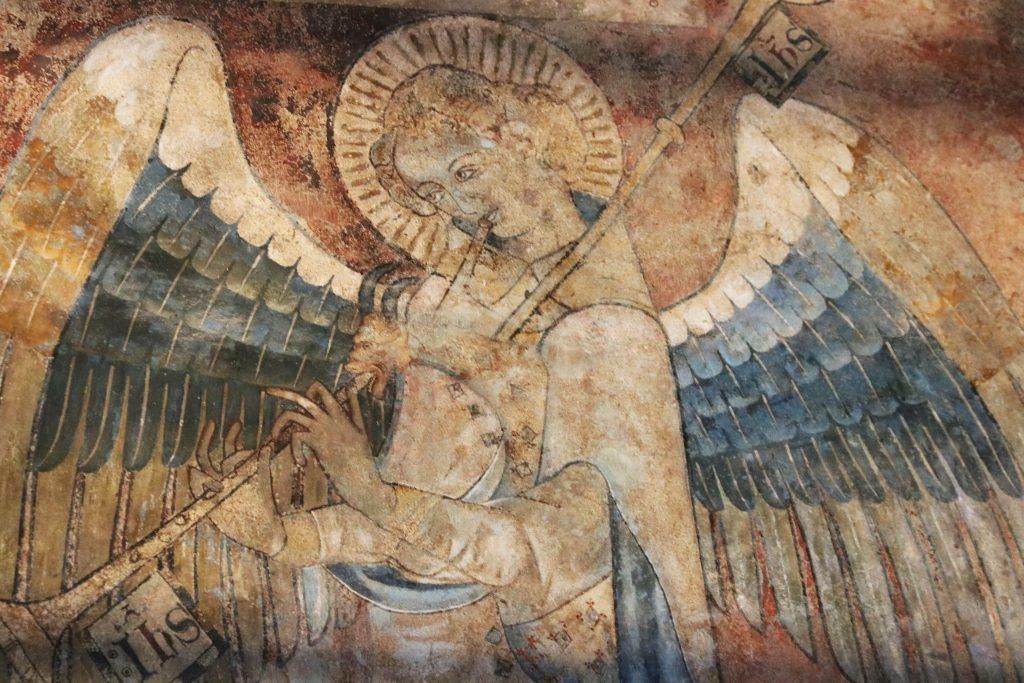 On a de bonnes variétés d’instruments dans la musique profane. Mais le rapport à l’instrument est beaucoup plus fermé du côté de la musique sacrée, où on considère que l’instrument est globalement, pendant la plus grande partie du Moyen-Âge, interdit car l’instrument nuisait à la transmission du message sacré par la voix. Cependant, on fait découvrir une variété d’instruments pendant la visite, même si le Couvent des Jacobins est plutôt associé à la musique sacrée. Il se trouve qu’on a différentes représentations d’instruments dans notre chapelle Saint-Antonin. En effet, si l’on n’utilise pas d’instrument dans la musique sacrée, on se permet de les représenter dans les peintures de ces lieux. On retrouve déjà la harpe, qui existe dans une forme assez proche de ce que l’on connaît aujourd’hui, ou par exemple l’orgue portatif. On a une belle variété d’instruments à l’époque médiévale !