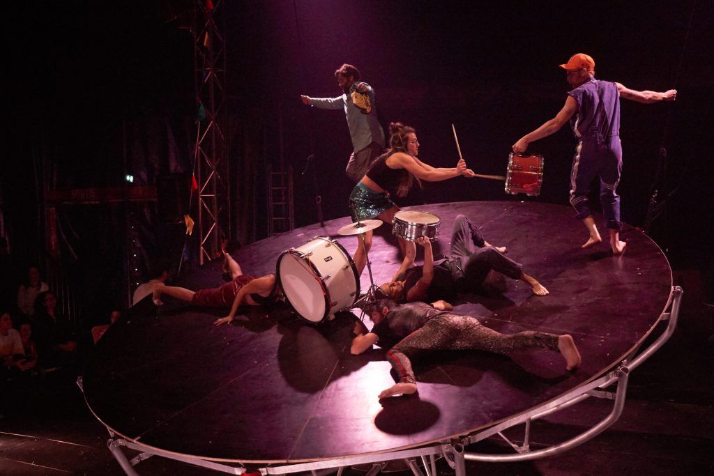 Au centre du spectacle, un gigantesque culbuto de six mètres de diamètre, véritable plateau circulaire bancal, devient un terrain de jeu périlleux. Dix circassiens y évoluent, affrontant les lois de la pesanteur dans un ballet où la chute est toujours possible. Le décor instable crée une dramaturgie physique où le vrai et le faux se confondent, offrant un mélange captivant de tension, de poésie et de chaos mesuré.
