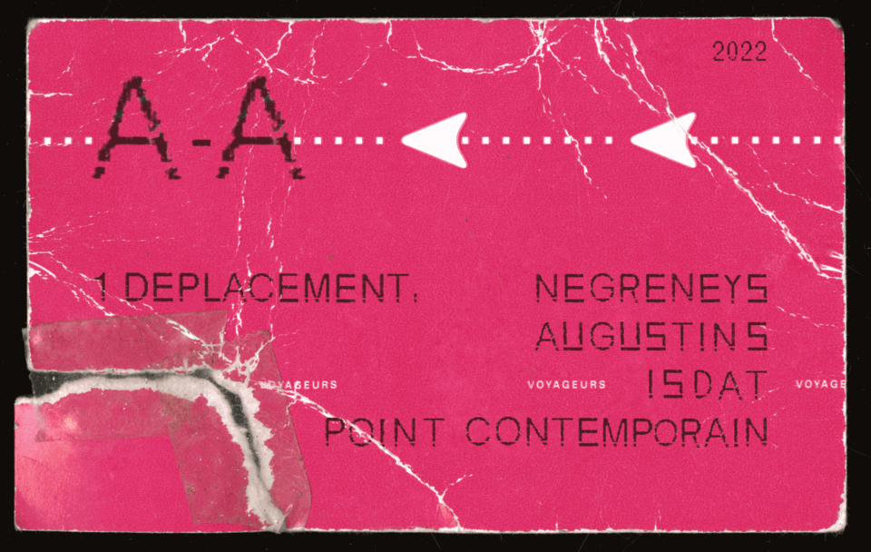 A-A est le résultat des recherches menées dans le cours « Déplacements » de Jean-Pierre Castex par les étudiant·es en année 3 option art de l’isdaT — institut supérieur des arts et du design de Toulouse. L’objectif de cet enseignement est de relier des pratiques d’ateliers, inhérentes à une école d’art, à des situations d’extériorité. En jouant avec les contraintes et les contingences, ils·elles franchissent toutes les étapes, de l’idée et de la première ébauche à la mise en place des objets et leur présentation au public.
