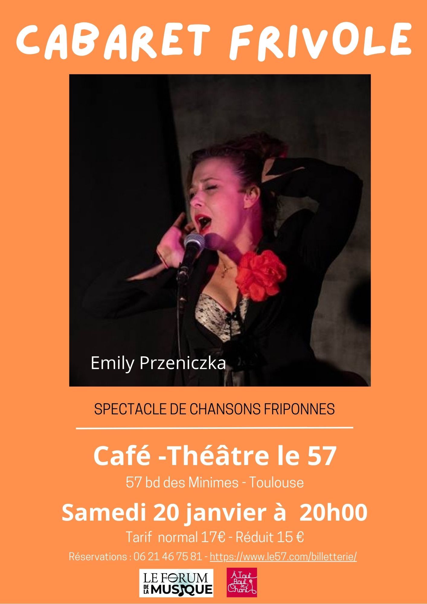 Le Cabaret Frivole, c’est un spectacle de chansons réalistes digne des cabarets parisiens tels qu’on les imagine du temps de Marie DUBAS, PIAF, FREHEL, PATACHOU, ou Suzie DELAIR ! Comme à l’âge d’or des cabarets, le public est évidemment pris à partie et se laisse emporter avec plaisir dans les délires fantasques de ce personnage de chanteuse fâchée (mais pas trop) avec l’amour!