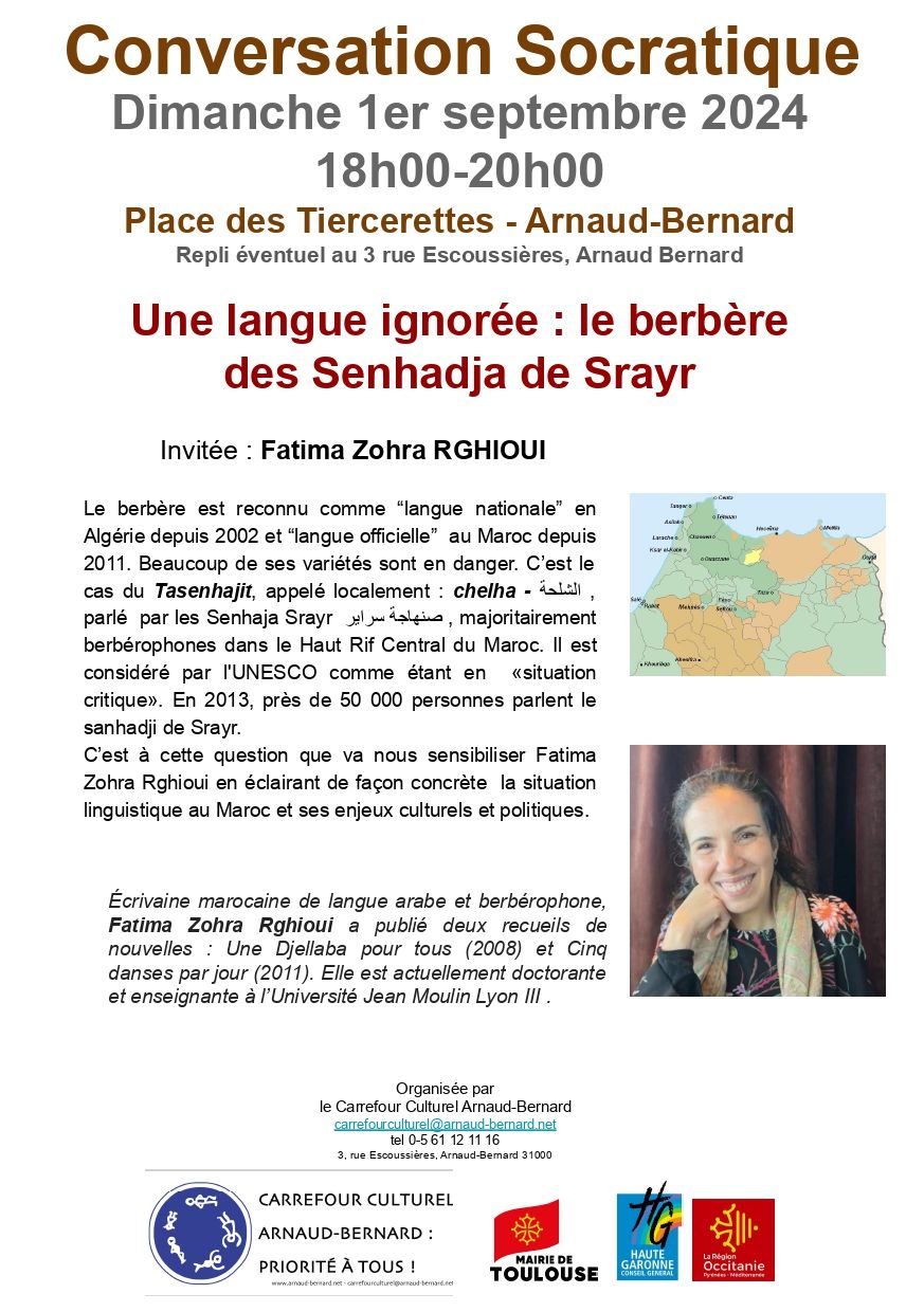 Une langue ignorée : le berbère des Senhadja de Srayr Le berbère est reconnu comme “langue nationale” en Algérie depuis 2002 et “langue officielle” au Maroc depuis 2011. Beaucoup de ses variétés sont en danger. C’est le, الشلحة – cas du Tasenhajit, appelé localement : chelha parlé par les Senhaja Srayr صنھاجة سرایر , majoritairement berbérophones dans le Haut Rif Central du Maroc. Il est considéré par l’UNESCO comme étant en « situation critique ». En 2013, près de 50 000 personnes parlent le sanhadji de Srayr.