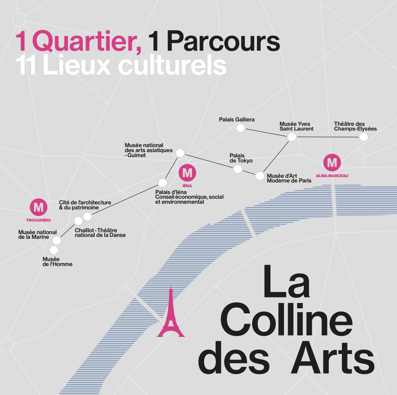 À l’instar des musées du Museuminsel de Berlin ou du MuseumsQuartier de Vienne, onze institutions culturelles situées entre l’Alma et la colline de Chaillot se sont associées pour former le réseau La Colline des Arts. Unique en France, ce quartier propose une offre culturelle exceptionnelle et rappelle que Paris est l’une des capitales mondiales des arts. Ce rapprochement confirme la volonté d’offrir une meilleure visibilité aux institutions et s’inscrit également dans la perspective des futurs aménagements qui prendront place entre le Trocadéro et le Champ de Mars pour les Jeux Olympiques et Paralympiques de 2024. Les institutions culturelles appellent en effet de leurs vœux des aménagements qui permettront aux publics de déambuler librement et dans un cadre renouvelé entre leurs bâtiments. Héritières, pour la plupart, des Expositions universelles de 1878 à 1937, chaque institution témoigne d’une histoire commune et d’une cohérence urbaine et architecturale.
