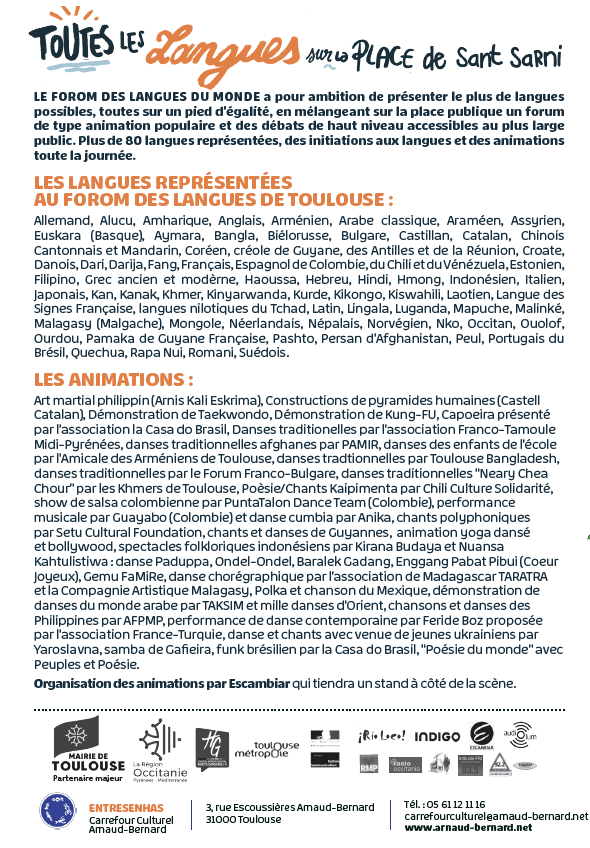 LE FOROM DES LANGUES DU MONDE a pour ambition de présenter le plus de langues possibles, toutes sur un pied d’égalité, en mélangeant sur la place publique un forum de type animation populaire et des débats de haut niveau accessibles au plus large public. Plus de 80 langues représentées, des initiations aux langues et des animations toute la journée.