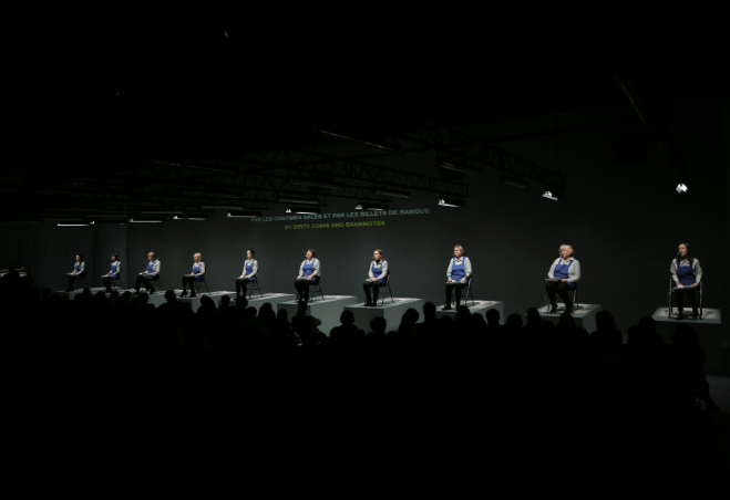 Dix femmes en uniforme sont assises et tiennent des machines à scanner des codes-barres. Tout y est, du cliquetis des caisses au bourdonnement des client∙e∙s. Dans la vie de tous les jours, elles adopteraient un ton machinal : « Bonjour. Merci. Bonne journée ! ». Chanté, cela change tout. Petit à petit, elles s’animent, leurs pensées et leurs secrets s’échappent, leurs voix virtuoses s’envolent.