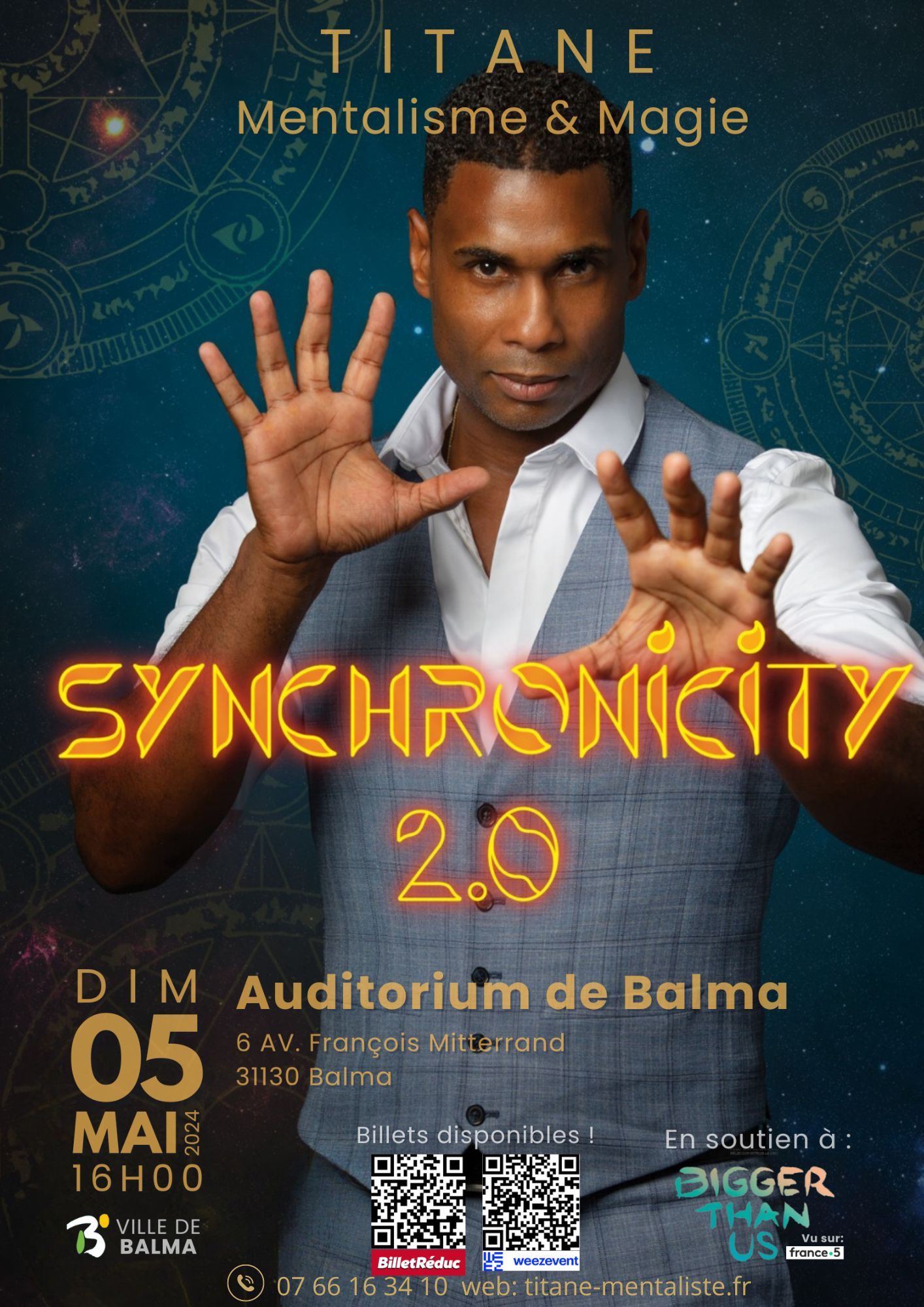 Dans ce spectacle Titane met en scène de manière ludique ces mécanismes mystérieux. Synchronicity 2.0 vous plonge dans des expériences nouvelles et originales de mentalisme subtilement saupoudrées de magie, à travers lesquelles vous serez surpris des facultés dont vous êtes dotés.
