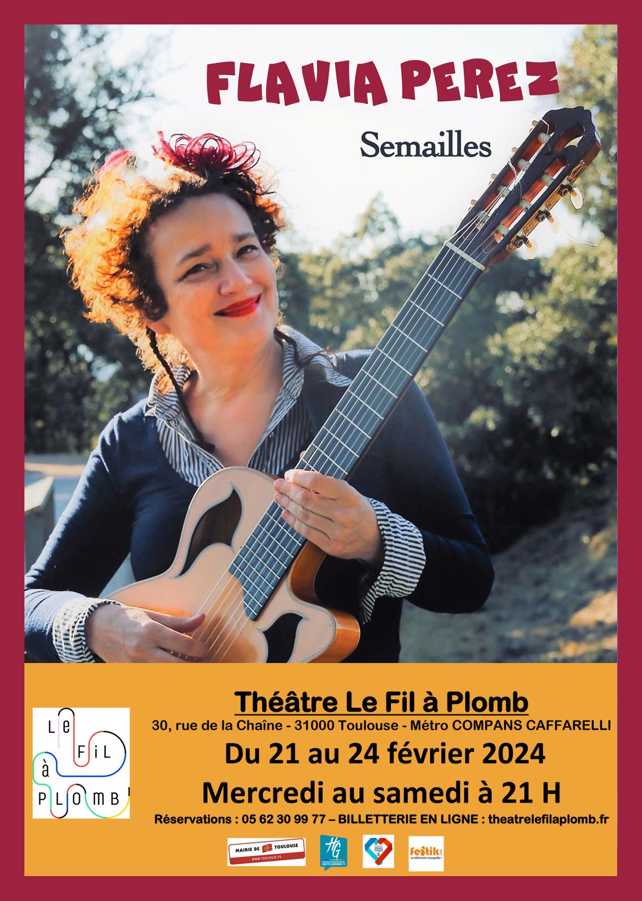 À la faveur de la sortie le 19 octobre 2023 de son nouvel album : « Fleurs de bitume », le théâtre Le fil à plomb à Toulouse invite Flavia Perez et son nouveau spectacle de chansons intitulé : »Semailles ». Flavia Perez : voix guitare sampler et turbulences.