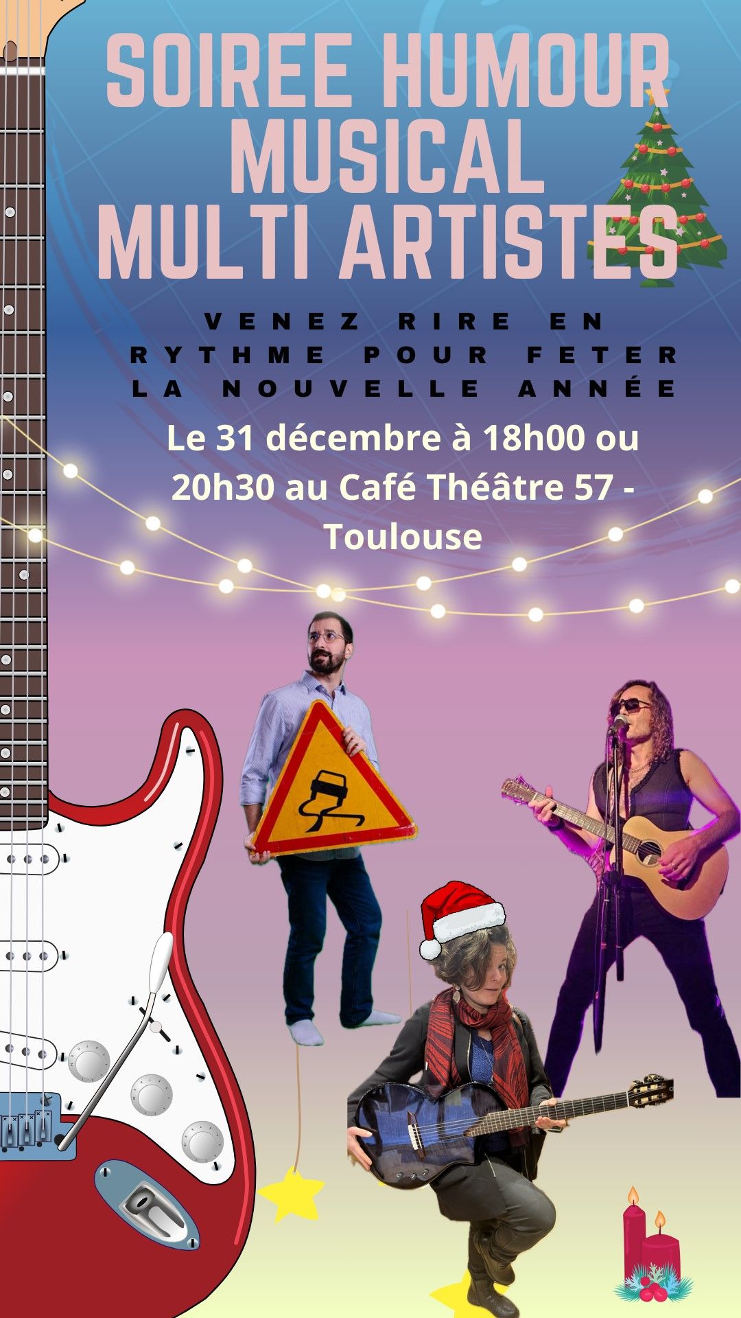Venez rire en rythme pour la dernière soirée de cette année 2023 avec ce beau programme de trois humoristes ET musiciens toulousains qui vous présenteront leur spectacle respectif et vous proposeront différents univers. Venez vous régaler avec la crème des artistes aux multiples talents.