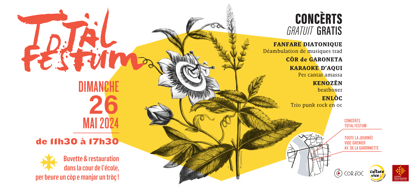 Dans le cadre de Total Festum 2024, festival des langues et cultures catalanes et occitanes soutenu par la Région Occitanie / Pyrénées-Méditerranée, la Calandreta de Garoneta présente, le dimanche 26 mai de 11h30 à 17h30 :