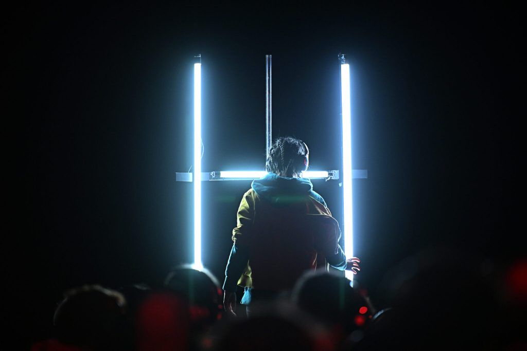 Le dispositif immersif répond à mon désir d’un théâtre sans frontière où se frôlent les actrices et les spectateur∙rice∙s, où la pensée est sensible, où notre position de spectateur∙rice, assis∙e au sol entouré∙e par les actrices, alimente notre regard critique.