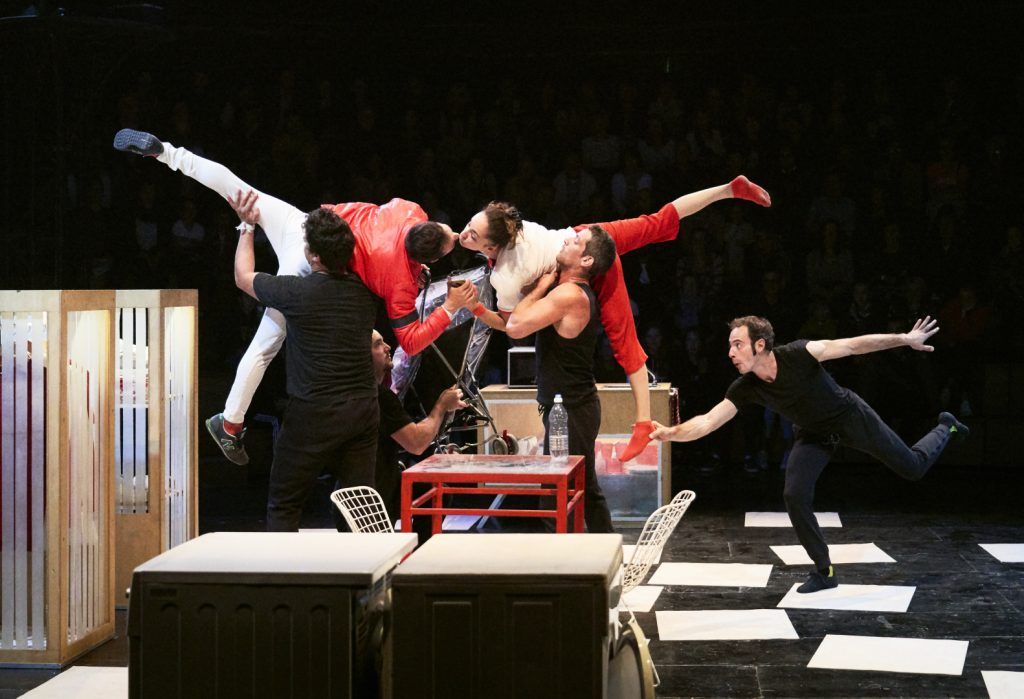 Ils entrelacent les gestes familiers aux acrobaties et pirouettes les plus incroyables et ils subliment les petits riens en prouesses de plus en plus folles. L’électroménager s’en mêle, tandis que les corps s’envolent avec grâce au milieu de ce charivari acrobatique et musical !
