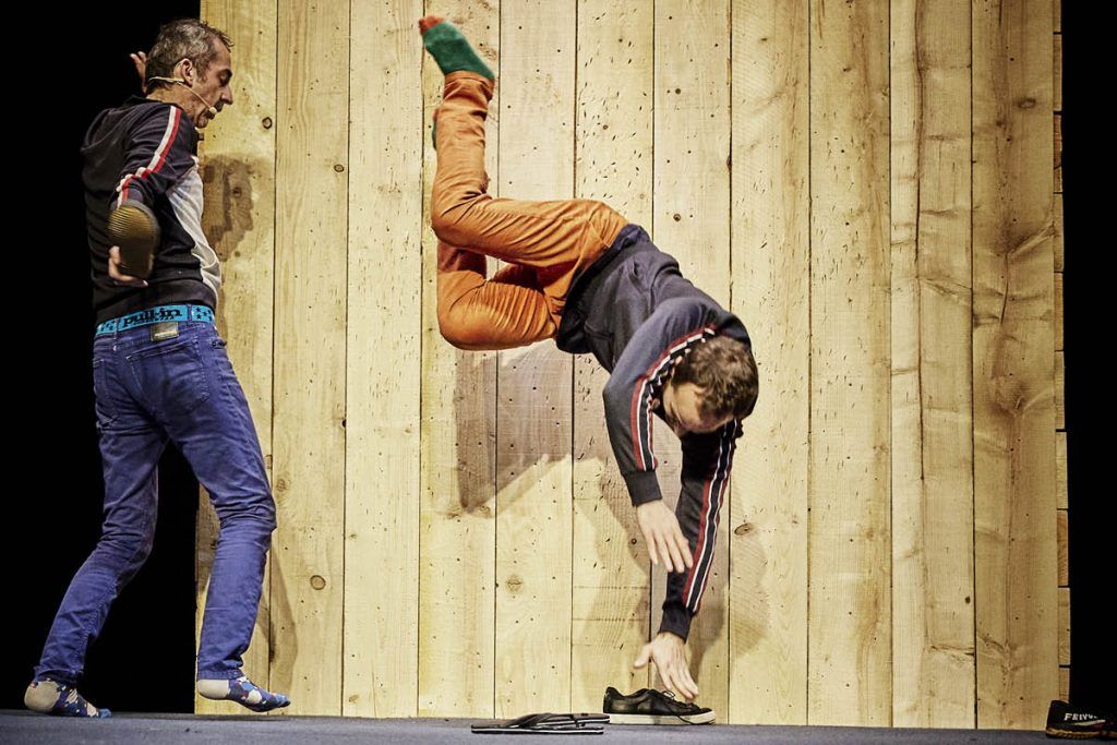 Une échelle, une planche, quelques lames bien tranchantes et des rondins de bois : c’est ce qu’il faut à ce binôme pour réussir ses exploits. Entre acrobaties, corps à corps, paroles et lancers de couteaux, le duo tisse une complicité qui se construit sur le fil ténu d’une confiance naissante. Qu’est-ce que le lien ? Équilibre et risques sont au cœur du spectacle pour y répondre et dessiner une histoire d’amitié, qui, même à couteaux tirés, tape dans le mille !