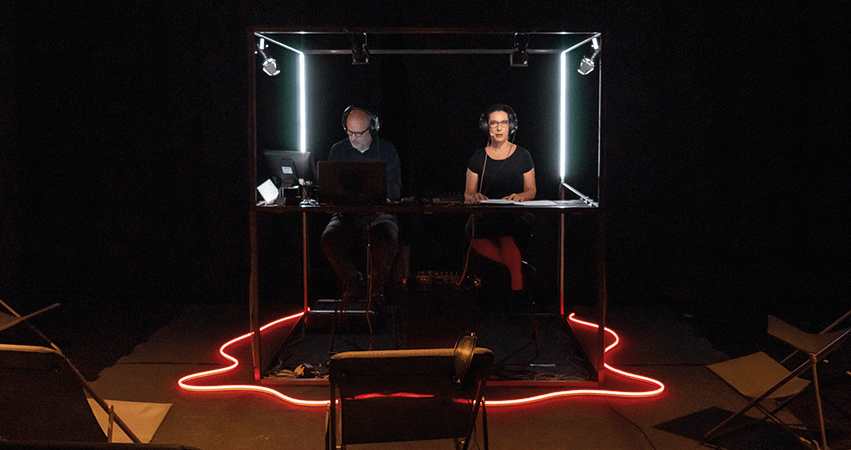 Dispositif autonome hybride de performances-lectures augmentées pour une comédienne (Corinne Mariotto) et un musicien (François Donato), avec écoute au casque.