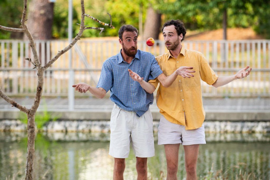 La relation fraternelle bourgeonne entre complicité et rivalité. Au rythme de la batterie, ils embarquent dans leur imaginaire. Les idées fusent, les pommes s’élèvent, les corps-à-corps se couvrent de terre, les jeux se multiplient… parfois jusqu’au débordement.