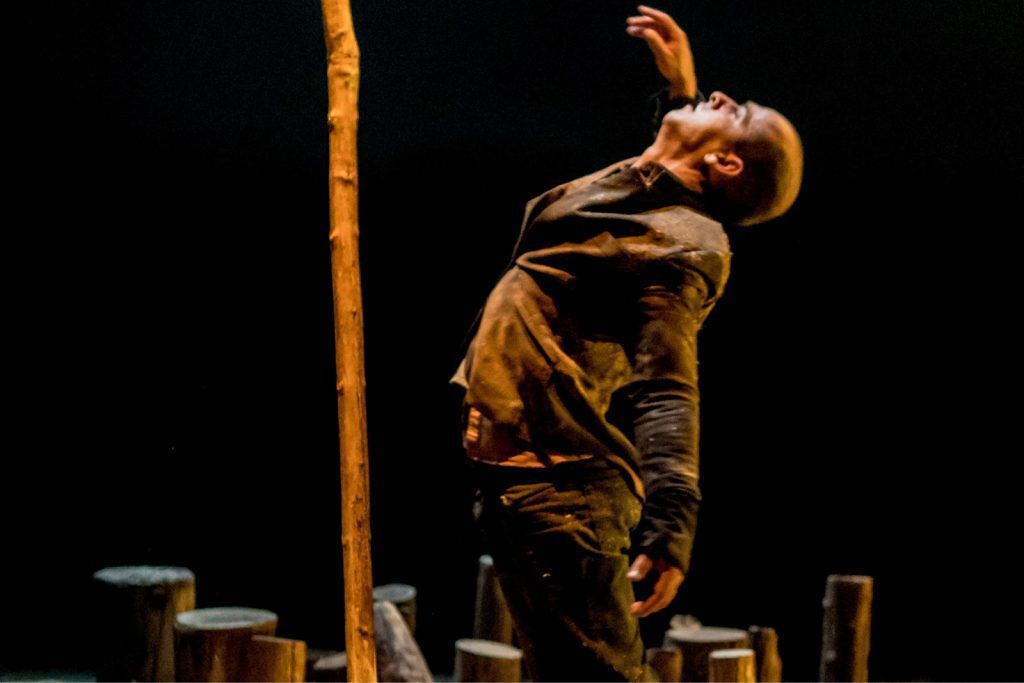 Un personnage-totem, des sons élémentaires de la Nature, une branche haubanée au sol et un corps humain à terre enseveli sous des décombres de bois.