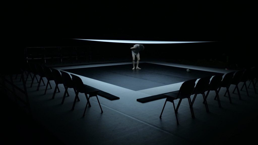 Dans un espace scénique volontairement restreint en hauteur, le danseur évolue dans une « caverne de voiles sans paroi ». Cette configuration oblige à repenser les postures habituelles, interdisant la station debout et invitant à une redéfinition de la condition humaine à travers des déplacements au sol.
