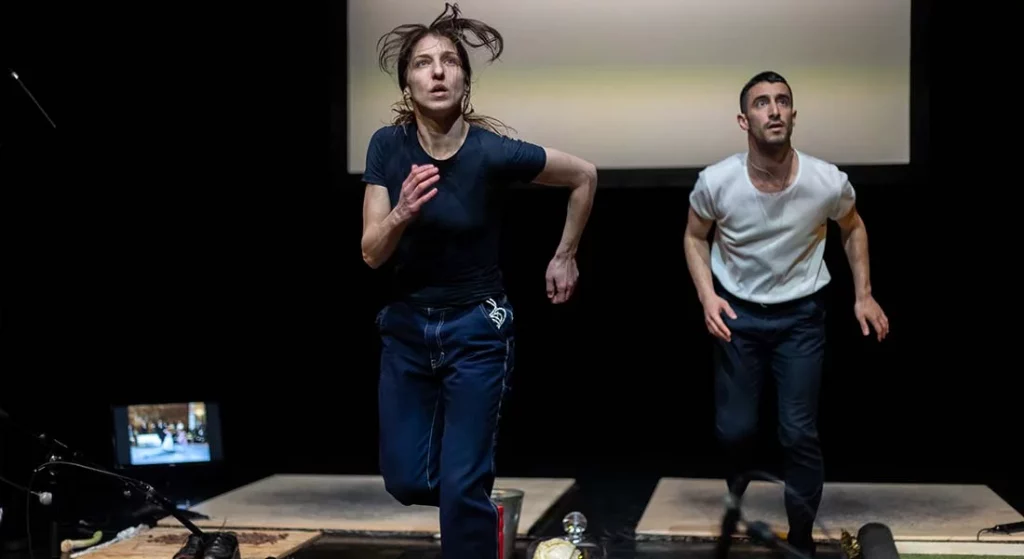 En duo avec Georgios Kotsifakis, la chorégraphe grecque Ioanna Paraskevopouloudéploie une “danse du bruitage”. Ici, une multitude d’objets incongrus (noix de coco, torchons, branches de céleri…) deviennent des instruments sonores, permettant de recréer en direct une bande sonore cinématographique. Avec « MOS » l’artiste livre en fait une version longue du spectacle « Coconut effect », dans lequel elle dévoilait d’ores et déjà les coulisses d’un film sur scène, en 2023.